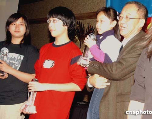 劉澤彭出席全美華裔青少年繪畫大賽頒獎儀式。劉澤彭抱起一名美裔華人小姑娘為她頒獎。作者:賈國榮