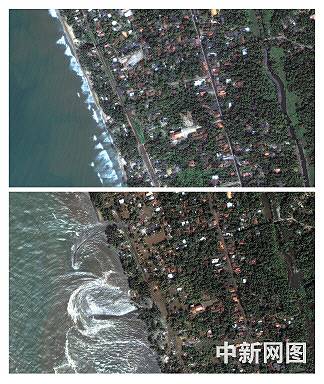 這張合成圖片來自2004年12月29日“電子全球”接收到的衛(wèi)星圖片。上方圖片攝于2004年1月1月,下方圖片則攝于當(dāng)?shù)貢r間2004年12月26日上午10點(diǎn)20分。當(dāng)時一場海嘯剛剛席卷了斯里蘭卡西南部卡魯塔拉市,翻卷的海水正在涌出海岸線外。