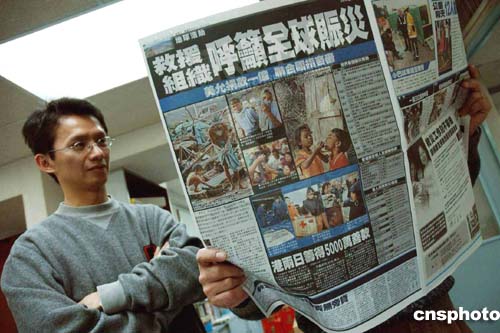 香港報(bào)刊報(bào)導(dǎo);南亞海嘯世紀(jì)大災(zāi)難首次傳來(lái)港人死訊,1名39歲香港男子證實(shí)在泰國(guó)布吉死亡,在這次災(zāi)難中,另有213港人失去聯(lián)絡(luò)。12月 29日上午,市民閱讀當(dāng)天新聞密切關(guān)注有關(guān)消息。作者:洪少葵