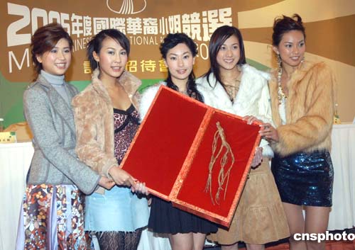 《2005年度國(guó)際華裔小姐競(jìng)選》記者會(huì)12月29日在香港舉行,應(yīng)屆港姐季軍符思思(左一)、04年度國(guó)際華裔小姐亞軍曹敏莉(左二)、04年度國(guó)際華裔小姐冠軍鐘嘉欣(右二)、應(yīng)屆港姐亞軍朱慧敏(右一)會(huì)上向徐子珊送上千年人參,以示鼓勵(lì)及支持。作者:鄧慶樂(lè)