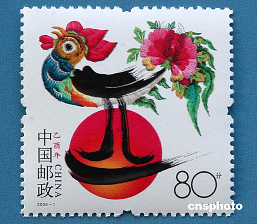 中國(guó)國(guó)家郵政局定于2005年1月5日發(fā)行《乙酉年》特種郵票1套1枚,郵票面值為人民幣80分。這套郵票是中國(guó)發(fā)行的第三輪生肖郵票中的第二套。在十二生肖排序中,雞象征著振奮和吉祥。北京市郵票公司為配合國(guó)家郵政局發(fā)行郵票,特設(shè)計(jì)印制了該郵票的首日封等郵品,與郵票同日發(fā)行。中新社記者:鄒憲