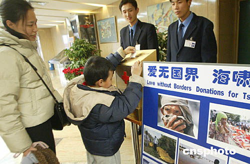 元旦假日期間,北京市民在各區(qū)縣設(shè)立募捐站,為遭受印度洋海嘯受災(zāi)的國(guó)家捐款。中新社記者:錢興強(qiáng)