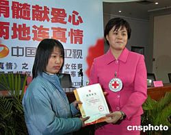 1月3日,湖南省副省長、省紅十字會會長甘霖(右)在長沙向捐獻(xiàn)骨髓的路敏頒發(fā)榮譽(yù)證書。來自湖南農(nóng)業(yè)大學(xué)的路敏今日將啟程前往北京提供造血干細(xì)胞,以救助遼寧14歲的白血病少女任爽。作者:鄧霞