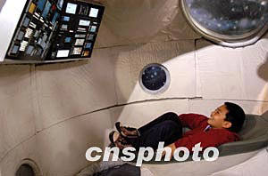 五月十五日,一名北京學(xué)童在當(dāng)日開幕的2004年全國科技活動周暨北京科技周展會上,模擬中國首位宇航員楊利偉乘坐神舟五號載人飛船太空倉的座椅上,用心感受太空飛行的樂趣。中新社記者:鄒憲
