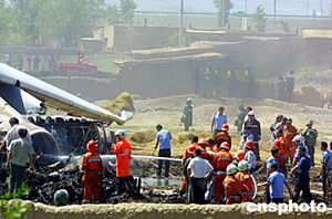 5月18日10時50分,阿塞拜疆一架伊爾76貨機在新疆烏魯木齊機場附近墜毀。這架貨機執(zhí)行太原至烏魯木齊(經(jīng)停)至阿塞拜疆巴庫任務,在烏魯木齊機場起飛兩分鐘后,墜落在跑道西頭約10公里處。機上共有7人遇難。 圖為救援人員在失事現(xiàn)場緊急救援。作者:維程金生