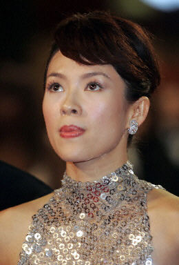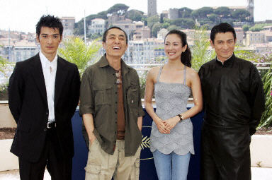 5月19日,中國電影導演張藝謀(左二)、女影星章子怡(右二)、男影星金城武(左)和香港老牌影星劉德華一起出席影片《十面埋伏》在法國南部影城戛納的首映式。