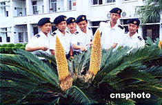 被廣東湛江評(píng)為“花園式單位”的軍港保障部隊(duì)營(yíng)區(qū)內(nèi)五月初出現(xiàn)了一道新風(fēng)景:十余棵鐵樹(shù)紛紛吐出了金黃色的花蕊,其中有兩棵還開(kāi)出了并蒂花。這一罕見(jiàn)奇葩,吸引了不少官兵前來(lái)觀賞。作者:梁利靈