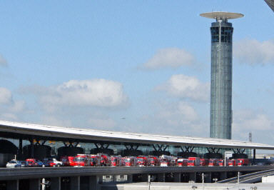 巴黎戴高樂機場坍塌事故現(xiàn)場。消防及救護車輛排起長龍。