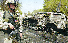 伊拉克當(dāng)?shù)貢r間5月17日上午,一列由5輛車組成的車隊駛近巴格達(dá)“綠區(qū)”駐伊聯(lián)軍總部12號檢查站,并依次通過,但就在最后一輛車將要通過的時候,一輛緊挨著車隊?康募t色大眾小車發(fā)出轟的一聲巨響,最后的那輛轎車連同前后左右的車輛變成了一團(tuán)火球,伊拉克臨時管理委員會(簡稱臨管會)輪值主席薩利姆就在那輛車上。