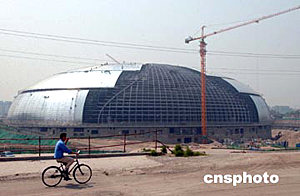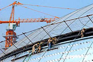 五月二十四日,建筑安裝工人正在國家大劇院殼體穹頂施工。國家大劇院橢圓形殼體穹頂自四月一日開始安裝鈦金屬板以來,工程進展順利,預(yù)計六月底完成。中國國家大劇院由法國設(shè)計師保羅·安德魯設(shè)計。中新社記者:張煒