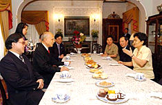 全國政協(xié)副主席、中共中央統(tǒng)戰(zhàn)部部長劉延?xùn)|25日下午抵達香港,隨即到全國政協(xié)副主席霍英東家看望霍英東,與霍英東父子親切交談。作者:洪少葵