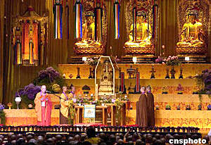 中新社香港五月二十六日電(記者邢健)“香港佛教暨各界迎請佛指舍利瞻禮祈福大會”開幕典禮今天(佛誕日)在香港會展中心隆重舉行。專程前來的全國政協(xié)副主席、中共中央統(tǒng)戰(zhàn)部部長劉延?xùn)|和香港行政長官董建華等在開幕式共同啟動亮燈按鈕,安放佛指舍利的禮臺頓時大放光明,佛指舍利清晰地呈現(xiàn)在信眾面前。