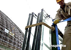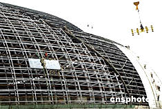 五月二十六日,位于北京人民大會堂西側(cè)的國家大劇院開始安裝殼體中央的曲線形玻璃幕墻,近6700平方米的幕墻將由1126塊有色玻璃組成,建成后街上的行人透過玻璃幕墻便可看到金碧輝煌的休息大廳中新社記者:鄭萍萍