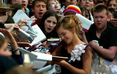 扮演哈利波特的丹尼爾在進入影院之前為影迷們在海報和照片上簽名!罢媸菈延^呀,我好激動,比紐約首映式的規(guī)模大多了。”
