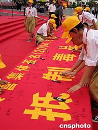 適逢民族英雄林則徐虎門硝煙一百六十五周年,福建省和廣東省禁毒辦聯(lián)袂在虎門主辦閩粵港澳臺青少年禁毒夏令營活動。圖為閩粵港澳臺青少年學(xué)生集體簽名,對毒品說“不”。作者:楊伏山