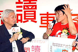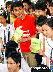 香港明星劉德華,六月五日出席九廣鐵路公司與香港電臺特別舉行的“閱讀車廂”啟程禮。圖為劉德華與學(xué)生一起參加該活動(dòng)啟程禮。 作者:錢興強(qiáng)