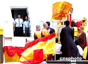 香港覺光法師五日上午十時四十分在香港國際機場登上恭送專機,恭送佛指舍利離港。中新社記者:趙振清