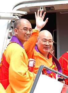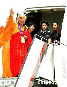 中國佛教協(xié)會副會長圣輝法師五日上午在香港國際機場登上恭送佛指舍利專機,護送佛指舍利回法門寺。中新社記者:趙振清