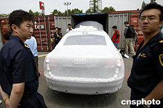 六月六日,參加二零零四年北京國際汽車展覽會的車輛陸續(xù)運(yùn)抵北京國際展覽中心。海關(guān)人員開始對參展汽車進(jìn)行逐一檢查。圖為參展車輛奧迪A8等待海關(guān)人員檢查。中新社記者:盛佳鵬