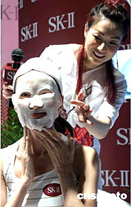 六月七日,百變天后鄭秀文在上海出任SK-II新美白天后,并在活動(dòng)現(xiàn)場指導(dǎo)一名年輕女孩使用面膜的正確方式。中新社記者:廖文靜