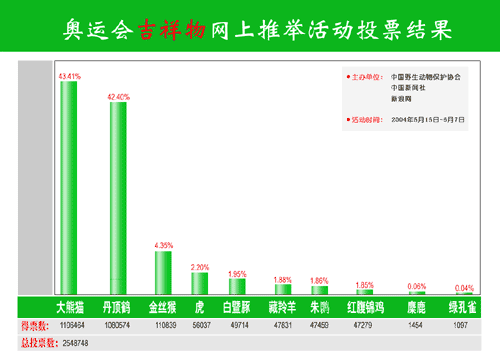 中國新聞社總編輯郭招金說,五百多萬網(wǎng)民踴躍投票,表達(dá)自己關(guān)注野生動物、保護(hù)野生動物、關(guān)注人文奧運(yùn)、參與綠色奧運(yùn)的熱烈情懷。他稱這次推舉活動展示的是東方人文精神的回歸,是東方文化“天人合一”的精髓的熱烈表達(dá)。