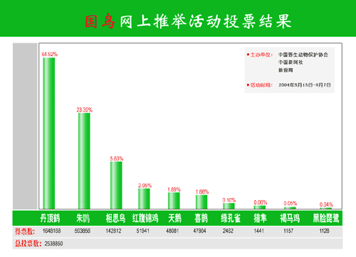 這項由中國野生動物保護(hù)協(xié)會、中國新聞社、新浪網(wǎng)聯(lián)合全國二十多家新聞網(wǎng)站舉辦的活動,在規(guī)模、規(guī)格、權(quán)威與影響上創(chuàng)造了此類推舉活動的全國之最。主辦單位今天介紹,在嚴(yán)格身份認(rèn)證的情況下,二十多天的推舉活動期間,全國三十個省市自治區(qū)以及東南亞華僑、華人在內(nèi)的五百萬網(wǎng)民參與了投票。引人注目的中國傳統(tǒng)文化鳥丹頂鶴集中了網(wǎng)民近六成的投票,即便是在吉祥物推舉中,也僅以微弱差距屈居第二。