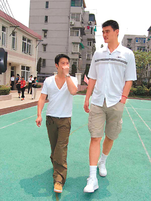 黎明和姚明首次碰頭,黎明六尺身高,本來個(gè)子已相當(dāng)標(biāo)準(zhǔn),但站在昂藏七尺五高度的姚明旁邊,黎明立即顯得矮了一截,縱使黎明踮高腳也只是到姚明的膊頭,黎明需要仰望才能跟姚明交談,結(jié)果弄得膊頭酸痛。