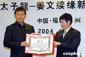 影帝姜文六月十三日在福州出席“太子龍-姜文續(xù)緣新聞發(fā)布會(huì)”時(shí),接受浙江太子龍服飾有限公司董事長王培火頒發(fā)的聘書,繼續(xù)擔(dān)任太子龍形象代言人。這種延續(xù)合作在中國文藝界名人中為數(shù)不多。由姜文監(jiān)制并主演的太子龍新廣告片十三日在福州與媒體和觀眾見面,其精湛的演繹再次獲得眾口一詞的贊嘆。中新社記者:毛建軍