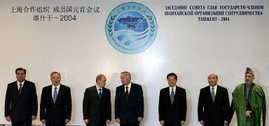 6月17日,上海合作組織塔什干峰會(huì)在烏茲別克斯坦首都塔什干召開,六個(gè)成員國元首與阿富汗過渡政府總統(tǒng)卡爾扎伊合影。左起:塔吉克斯坦總統(tǒng)拉赫莫諾夫,哈薩克斯坦總統(tǒng)納扎爾巴耶夫,俄羅斯總統(tǒng)普京,烏茲別克斯坦總統(tǒng)卡里莫夫,中國國家主席胡錦濤,吉爾吉斯斯坦總統(tǒng)阿卡耶夫,阿富汗過渡政府總統(tǒng)卡爾扎伊。