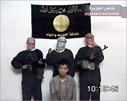 20日晚,阿拉伯“半島”電視臺播放了一段錄影帶,畫面上的武裝份子稱,除非韓國保證在24小時內(nèi)停止派兵赴伊拉克,否則他們將把一名韓國人質(zhì)斬首。綁架人質(zhì)的武裝分子自稱屬于“團(tuán)結(jié)圣戰(zhàn)組織”。該組織曾多次通過電子郵件向半島電視臺發(fā)送綁架人質(zhì)的錄像片段,或在其網(wǎng)站上聲稱對某一襲擊事件負(fù)責(zé)。據(jù)稱,該組織由恐怖頭目扎卡維領(lǐng)導(dǎo),與“基地”組織有聯(lián)系。