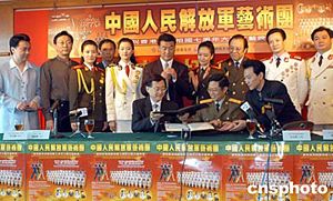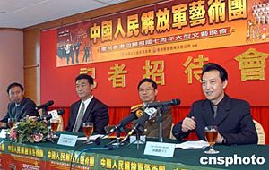 為慶祝香港回歸祖國(guó)七周年,中國(guó)人民解放軍藝術(shù)團(tuán)6月21日抵港并舉行記者會(huì),解放軍藝術(shù)團(tuán)團(tuán)長(zhǎng)王兆海少將與東華三院主席陳耀莊簽署捐贈(zèng)協(xié)議。藝術(shù)團(tuán)將在23、24日在紅館演出,門票全部售罄,收入全部捐贈(zèng)香港東華三院作慈善服務(wù)經(jīng)費(fèi)。作者:鄧慶樂(lè)