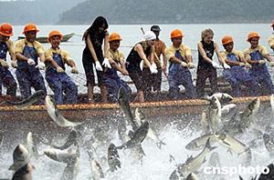 6月21日,參加2004年國際旅游小姐冠軍總決賽的選手們來到浙江著名旅游景區(qū)千島湖與漁民一起進行大網(wǎng)捕魚,體驗豐收的喜悅。中新社記者:盛佳鵬