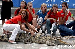 廣州番禺香江野生動(dòng)物世界六月二十四日迎來參加“二零零四國際超模大賽”國際總決賽佳麗,眾美女在園中與鱷魚親密接觸。她們將參加六月二十六日在廣州舉行的總決賽。作者:中新社