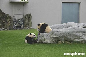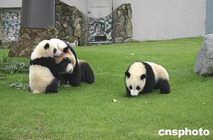 六月下旬,世界第一對由母體同時撫育長大的大熊貓“隆浜”和“秋浜”與母親“梅梅”在日本和歌山白浜野生動物園草坪上玩耍。這對雙胞胎二零零三年九月八日出生在日本,“隆浜”現(xiàn)在體重已達(dá)十七點(diǎn)九公斤,“秋浜”達(dá)十九點(diǎn)三五公斤,體態(tài)嬌憨,十分惹人喜愛。一般說來,熊貓產(chǎn)下雙胞胎,由于顧此失彼,很難由母體成功地?fù)嵊W髡?肖龍聯(lián)