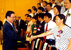 第八屆中國青年科技獎(jiǎng)六月二十八日在北京揭曉并頒獎(jiǎng)。圖為中共中央政治局委員、中央人才工作協(xié)調(diào)小組組長賀國強(qiáng)接見獲獎(jiǎng)代表。作者:郭昊