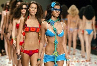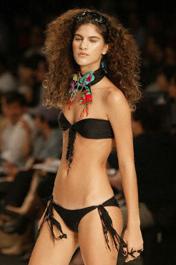6月30日,里約熱內(nèi)盧時裝周上模特展示設(shè)計師Miquelina設(shè)計的比基尼。
