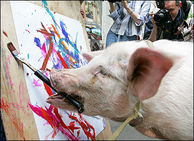 “豬的藝術(shù)”:一只被稱作“Malevich”的小豬在莫斯科市區(qū)“作畫”,這是當?shù)厮囆g(shù)家展示動物繪畫技藝的一部分。