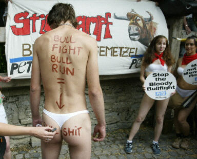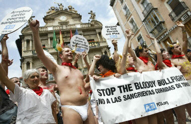 抗議隊伍沿著奔牛節(jié)中野牛奔跑的狹窄街道前進,他們高呼:“肉體折磨和摧殘并非是西班牙文化!停止血腥的奔牛活動!”