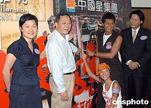 港產(chǎn)電影《柔道龍虎榜》兩位男女主角古天樂(lè)、應(yīng)釆兒及導(dǎo)演杜琪峰7月7日在香港出席樓盤長(zhǎng)旺雅苑「電影預(yù)展中心」揭幕儀式,并主持亮燈儀式。作者:鄧慶樂(lè)