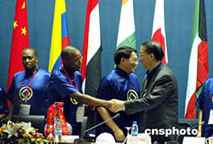 為期十天的第二十八屆世界遺產(chǎn)委員會會議七月七日在蘇州順利閉幕。閉幕式上通過了下屆世遺大會主席的選舉議程,南非的丹巴·瓦卡什當選第29屆世界遺產(chǎn)委員會會議的主席。圖為章新勝與丹巴·瓦卡什握手(左)。作者:蔣振江