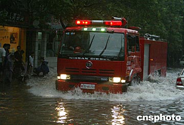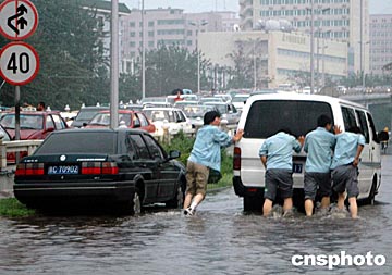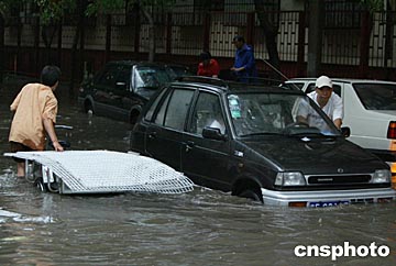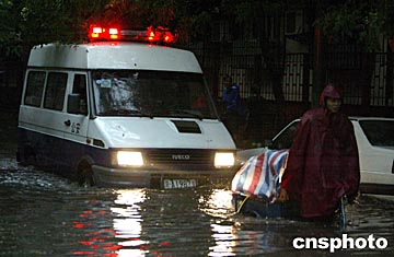 10日下午4時(shí)許,北京上空電閃雷鳴,突遭瓢潑大雨,北京城區(qū)部分街道水深及膝蓋,部分車輛因發(fā)動(dòng)機(jī)進(jìn)水而癱瘓于路中,城區(qū)交通嚴(yán)重?fù)矶隆?