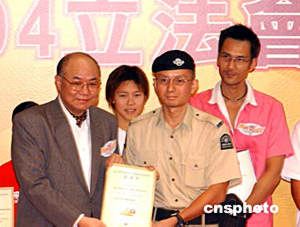 2004年香港立法會(huì)選舉開幕典禮17日在文化中心大堂舉行﹐選舉管理委員會(huì)主席胡國興大法官向選舉大使頒發(fā)證書。