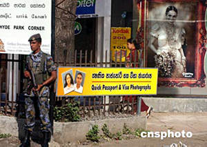 七月的斯里蘭卡首都科倫坡街頭,一位全副武裝的衛(wèi)兵在婚紗店執(zhí)勤。斯里蘭卡至今對反恐怖活動(dòng)百倍警惕。中新社記者:賈國榮
