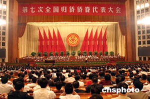 中新社北京七月二十日電 第七次全國(guó)歸僑僑眷代表大會(huì)二十日在人民大會(huì)堂隆重開(kāi)幕。胡錦濤、吳邦國(guó)、溫家寶、賈慶林、曾慶紅、黃菊、吳官正、李長(zhǎng)春、羅干等黨和國(guó)家領(lǐng)導(dǎo)人到會(huì)祝賀。