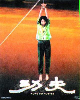 雖然片名是《功夫》,但海報中的星爺卻并沒以武林高手形象出現(xiàn),反見穿西褲、T恤衫的星爺不但臉容憔悴,且被一條繩吊在半空之中,看似非常潦倒落泊。
