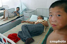 七月二十七日,幾名文樓村艾滋病人在該村衛(wèi)生院接受免費治療。河南上蔡縣文樓村全村共三千二百一十一人,其中有賣血史的多達一千三百一十人,全村共有艾滋病人四百五十五人,全村百分之七十的人家有艾滋病人或艾滋病毒攜帶者。今年新建成的村衛(wèi)生院,占地六畝,門診、化驗、心電圖、X光室、藥房、資料室,一應俱全。作者:慎重