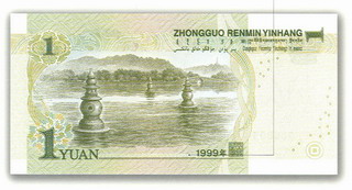 新版一元紙幣背面主景圖案為杭州西湖,左上方印有阿拉伯?dāng)?shù)字“1”,左下方印有面額“1YUAN”,右上方為“中國(guó)人民銀行”漢語拼音和蒙、藏、維、壯四種民族文字的“中國(guó)人民銀行”字樣、面額,右下方為年號(hào)和“行長(zhǎng)之章”印鑒。
