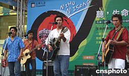 宏利人壽臺灣公司、臺北愛樂電臺等攜手制作出由花蓮縣“太平國小布農(nóng)兒童合唱團”演唱的CD。CD義賣所得,將捐給臺癌癥希望協(xié)會。圖為四名原住民成人歌手,為推動CD義賣在街頭落力演唱。中新社記者:董會峰