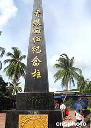 二○○四年七月下旬,在海南興隆華僑農(nóng)場的亞洲熱帶風(fēng)情園里,豎立著兩尊黑色金字的柱子。據(jù)悉,它們是香港與澳門回歸紀(jì)念柱,這兩尊柱子是該風(fēng)情園的一大景觀。作者:顧時宏