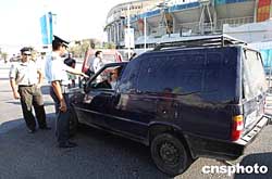 (當?shù)貢r間)二○○四年八月二日上午,多名希臘警察在雅典奧運會主會場嚴格檢查進入該地的人員車輛,以加強會場安保。中新社記者:任晨鳴